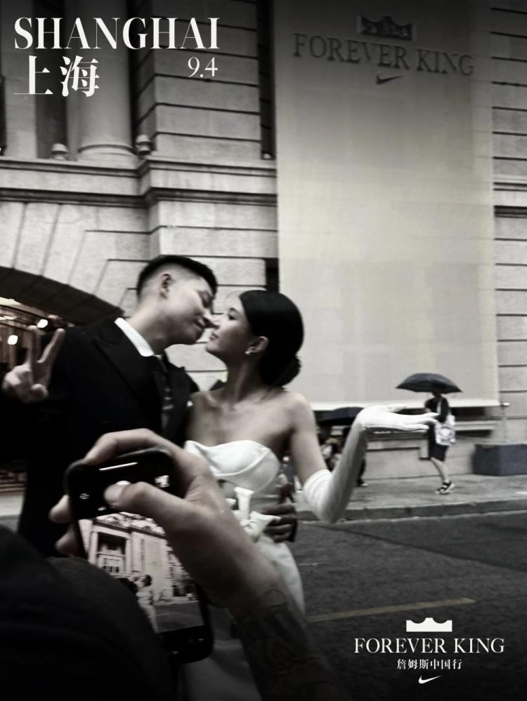 一对来自贵阳的年轻夫妻,早在半年前就定好9月4日在上海外滩拍摄婚纱照。新郎曾是篮球运动员,也是追随詹姆斯多年的球迷。他怎么都没想到,自己人生中如此重要的一天,竟与詹姆斯中国行不期而遇。在“FOREVER KING”的巨幅海报前,他笑着说:“好幸运,这一切都是天意。”
