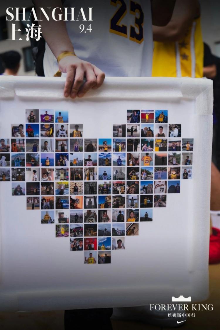 这幅爱心相框由100位未能来到现场的詹姆斯粉丝的照片拼成,每个人都身着詹姆斯球衣,把热爱定格成一张张具象的画面。当天,一位抢到门票的幸运球迷将相框带到现场,他说:“我要替兄弟们完成这个心愿,让詹姆斯看到他们的支持。” 在人潮的喧嚣中,这份来自天南海北的心意,显得格外真挚与温暖。
